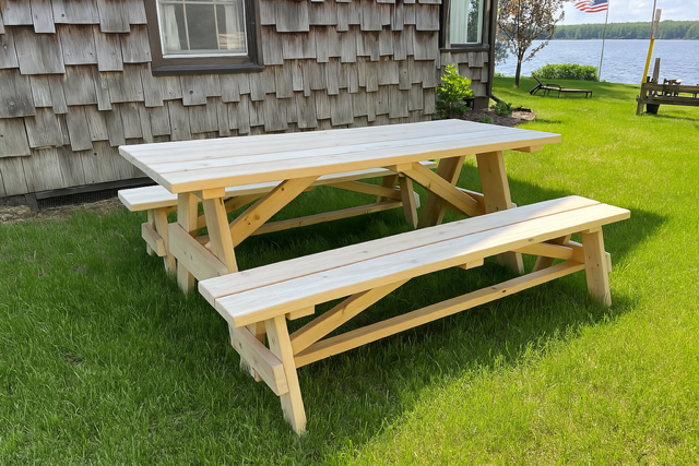 We take great pride in the construction of our cedar picnic tables and guarantee only the best lumber is used. Our picnic tables are hand-made in our shop in northern Maine. We offer two styles of tables- the standard attached bench and our own design of the separate bench style. All picnic tables are made using northern white cedar.